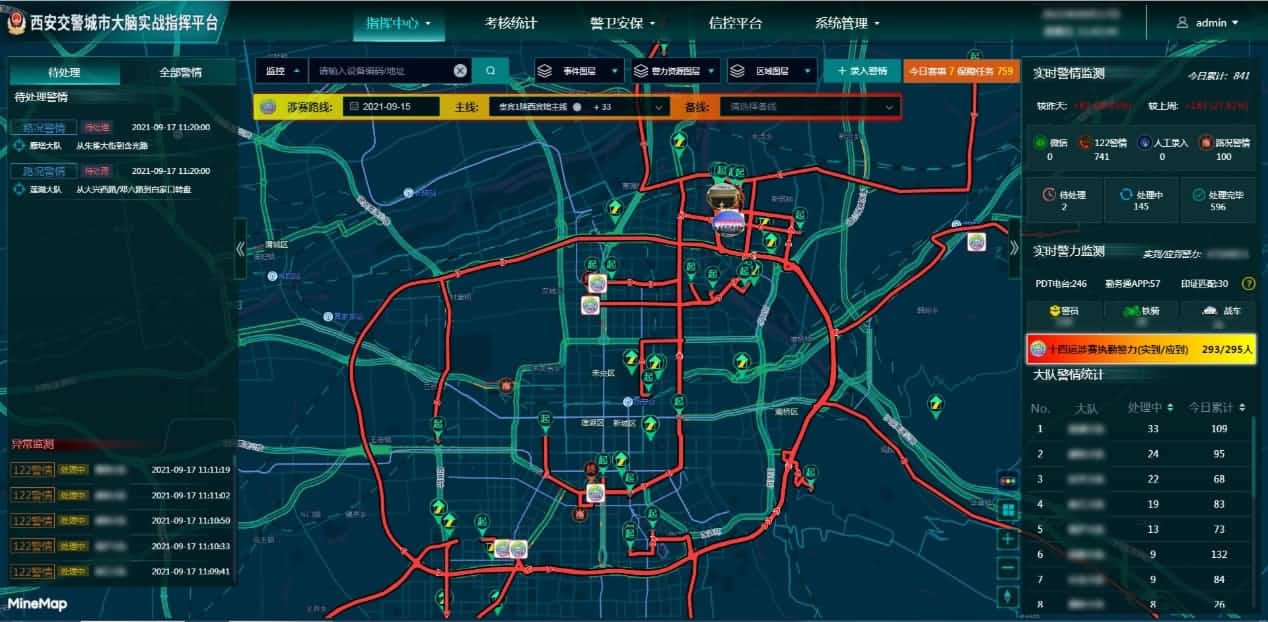 为包管十四运时代的交通顺畅和资源多方调动,世纪高通建设“都会大脑”可视化指挥调理系统。该系统基于世纪高通二三维GIS引擎和动态路网数据,开发十四运蹊径包管、蹊径周边警力(警员和岗位)、全运停车场及智慧铁骑图层等功效,在融合路况、警员、警车视频、智慧铁骑、交警监控在内的新闻态交通治理资源基础上,以“一张底图”为支持,全局掌握十四运时代全市交通态势,为指挥中心提供全调理资源信息,实现对突发事务的警力快速精准调配派遣,同时为车流量疏导指挥提供参考,全力做好涉赛蹊径及奥体中心场馆周边的交通保畅事情。